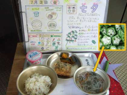 今日は七夕です。給食では7月3日が七夕こんだてでした。そうめんを天の川にオクラを星に見立てた七夕そうめんが登場しました。