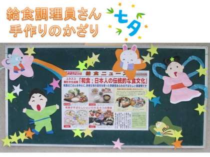 残念ながら今日は雨で夜空の星を眺めることはできそうにありませんが,給食室前の掲示板の織姫と彦星は素敵な笑顔で子どもたちを迎えてくれていました。