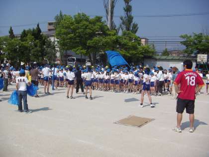 中間休みは体育館で準備運動の練習。踊るの大好きな1年生は,汗いっぱいで準備運動をしています。