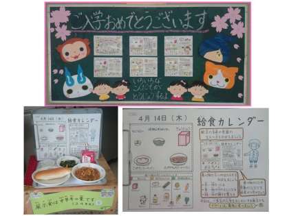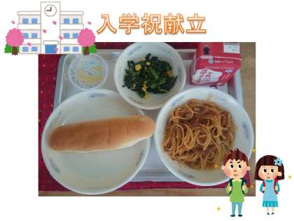 いよいよ給食が始まりました。初日の給食は,『小型コッペパン・牛乳・スパゲティのミートソース煮・ほうれん草のソテー』でした。