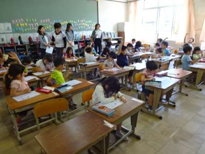 13日(金),保育園や幼稚園の先生に来てもらい,1年生の授業を見てもらいました。出身保育園や幼稚園の先生が来てくれるということで,1年生は朝からそわそわ。いざ参観が始まると,少し緊張した面持ちで,国語の授業を頑張っていました。卒園して1か月半,少し成長した姿を見てもらえたかな…!?