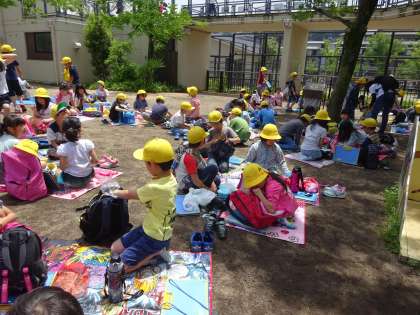 お昼ご飯は,キリンが見える広場で食べました。子どもたちがお弁当を食べている時に,キリンももぐもぐと草を食べたり,水を飲んだりしていて,子どもたちも喜んでいました。2年生みんなで,いい思い出をつくることができました。