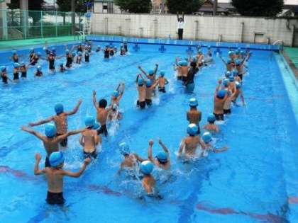 プールの中で歩いたり,走ったり,ジャンプしたりして学習しています。