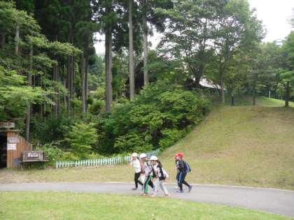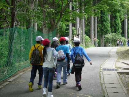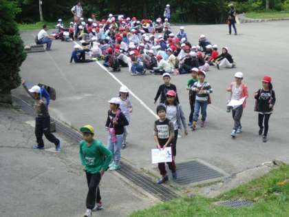昼食後、最初の活動は所内ラリーでした。お弁当を一緒に食べた大薮小学校との交流班ごとに花背山の家の所内をめぐるコースを回りました。
