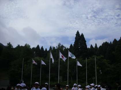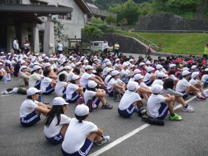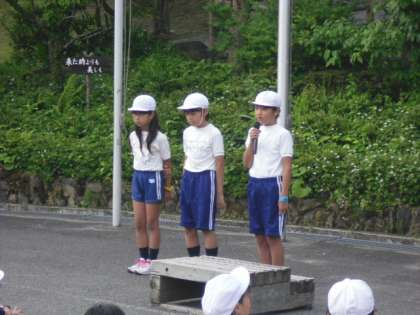 6時に起床した子どもたちは、7時から大薮小、光徳小と合同の朝の集いに参加しました。朝の集いでは3校がの代表の児童がそれぞれの学校を紹介しあいました。