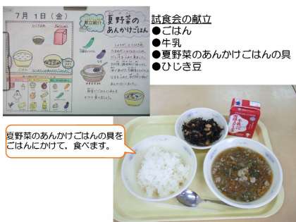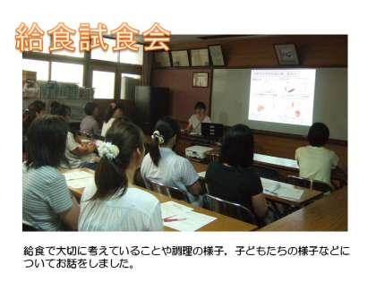 7月1日(金)に1年生の保護者の方を対象に給食試食会を行いました。給食の献立を考える時や調理の時に大切にしていることなどを子どもたちの様子も交えながらお話をしました。そのあと,子どもたちの給食当番の様子や食べている様子などを参観していただき,給食も食べていただきました。