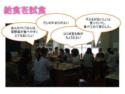 参加された保護者の方からは,「手作りの給食に安心しました」「子どもにも伝えたい」「子どもたちの成長に欠かせないですね」「家では食べない物も学校ではがんばって食べていました」「家でもお手伝いをさせていこうと思います」などのお声をいただきました。