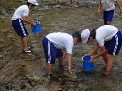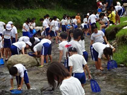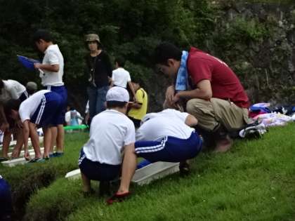 午後は水生生物の観察をしました。網や手で生き物を採っていきます。グループで協力して,少し短い時間にはなりましたが,たくさんの生き物を見つけることができました。