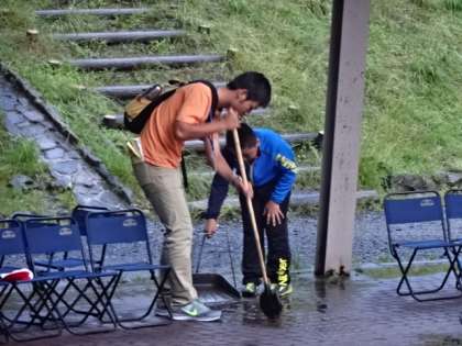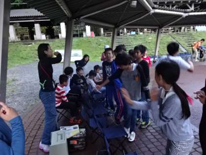 雨が奇跡的に上がり,外でのキャンプファイヤーをしようということになり,レク係やボランティアの先生たちが準備をしてくれました。水を取り,いすを並べ,事前のリハーサルをして…,とやること盛りだくさんでしたが,「みんなで素敵なキャンプファイヤーにしよう」という思いのもと,協力して準備しました。おかげでキャンプファイヤーが予定通りにできました!