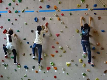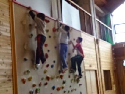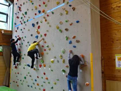 一つ目はアスレチックの予定でしたが,昨日の雨で木がぬかるんでいたために,体育館にて「ボルダリング」を行いました。4mほどの高さの壁を一歩一歩ならぬ,一手一歩確実に掴みながら登っていきます。最初は怖気づいている子も見られましたが,慣れるにつれて掴む石の色を決め,レベルを上げていく子も見受けられました。