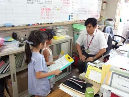 1年生は夏休み前の生活の学習の締めくくりとして,「なかよしいっぱいだいさくせん」の学習で,校内の教職員にインタビュー活動をしています。5月の学校探検で疑問に思ったことを解決するべく,聞きたいことを考え,準備し,当日を迎えました。