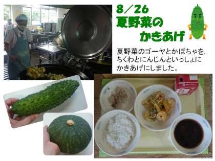 夏休みが終り,給食もスタートしました。まだ暑い日が続いている中での久しぶりの給食でしたが,子どもたちのしっかりと食べる様子に安心をしました。まだまだ残暑が続く9月。給食では夏野菜のゴーヤやかぼちゃ,とうがん,ズッキーニ,枝豆などが登場します。夏の終わりを楽しみながら,元気に過ごしてほしいと思います。
