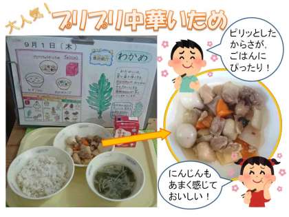 9月1日の給食は「麦ごはん・牛乳・プリプリ中華いため・わかめスープ」でした。プリプリ中華いためは給食で大人気の献立です。にんにくの香りとトウバンジャンのピリッとしたからさが食欲を増し,「おいしい!」と子どもたちはよく食べていました。