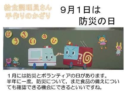 給食室では給食調理員さんの手作りのかざりで「9月1日防災の日」の掲示がされています。防災の備えについて考える機会になればと思います。