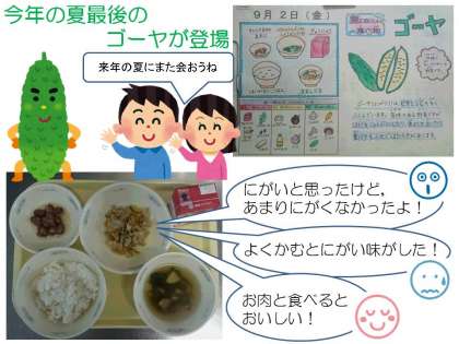夏の野菜「ゴーヤ」は,今年の給食ではこの日が最後になりました。また来年の夏,暑い夏を感じながら味わっていきたいと思います。