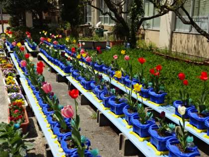 校門の枝垂桜が満開になりました。校内を見渡してみても,中庭のモクレンや2年生が1年生の時に植えたチューリップが咲き誇っています。春爛漫の久世西小学校です。