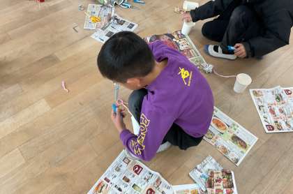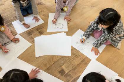 「保育園や幼稚園のお友達は、どんな遊びだと喜ぶかな。」「楽しめるように、おもちゃに絵を描こう。」と話し合いを進めながら、遊びを計画・準備しています。