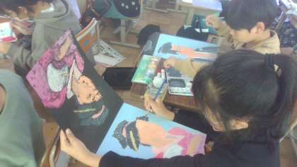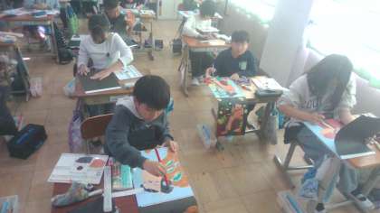 一版多色に取り組んでいます。線彫りはスムーズにいきましたが、色を塗って刷る作業がとてもエネルギーを要し、時間を要します。みんな粘り強く渾身の1枚を作成しています。