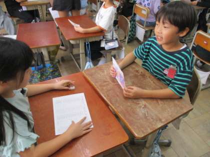 「ALPHABET」の学習では,自分のイニシャルカードを作るためにお店屋さん形式でカードを集めたり,出来上がったイニシャルカードを友だちに紹介したりしました。イニシャルカードに自分の好きな色をぬったり好きなものを描いたりして,とても楽しそうに紹介する姿が見られました。