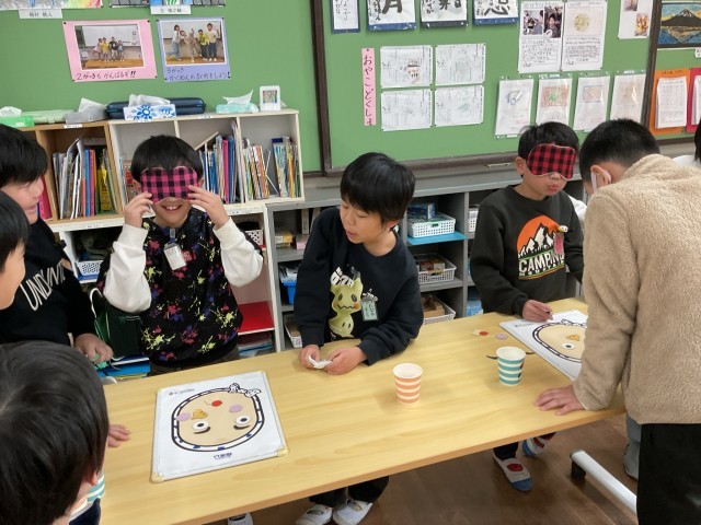 そのなかの「ふくわらい」では、「ひょっとこ」の顔をペアで協力して完成させました。