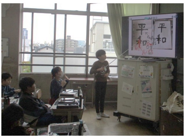 4年生の書写では,「平和」を毛筆で書いています。1回目の清書を写真にとり,どこをどう直したら字が整うかを自分で見つけたり,友だちにアドバイスをしてもらったりして学習を進めました。1回目の文字を超えられるように,集中して取り組む4年生でした。