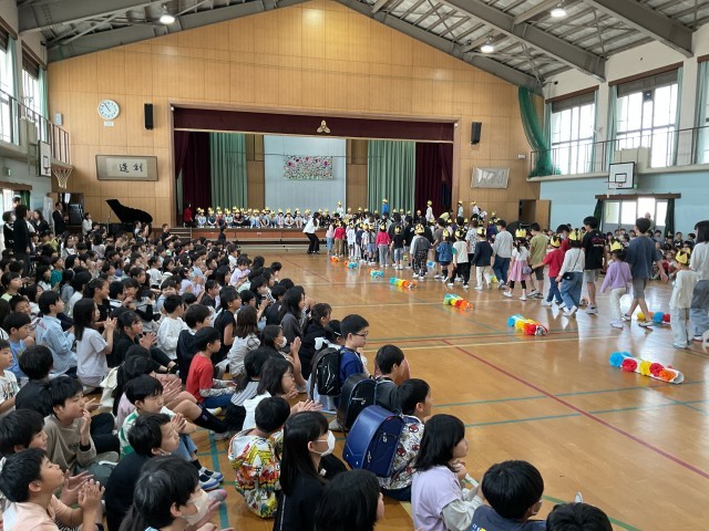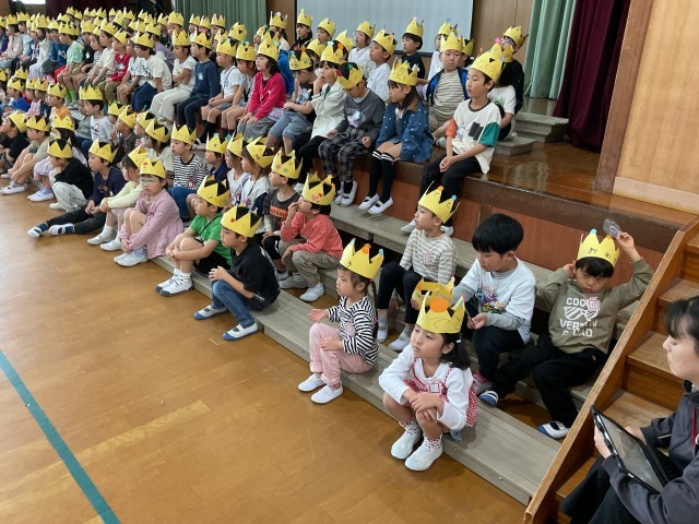 4月28日の3,4時間目に児童会主催の『1年生を迎える会』が行われました。計画委員の始めのあいさつの後、各学年が心を込めた出し物を披露してくれました。最後に、1年生のみんなでお礼をしました。これで今日から1年生も児童会の仲間入りです。