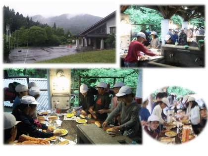 パックドッグは,パンにソーセージとカレー味のゆでキャベツを挟み,アルミホイルでくるんで牛乳パックに密閉して火をつけます。牛乳パックが燃えつきた頃,全体に火がいきわたり,おいしく焼きあがるという野外炊事です。アルミホイルにきちんと包むところがコツで,すき間があると,そこから火が入り焦げてしまいます。さて,うまく焼けるでしょうか。