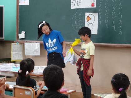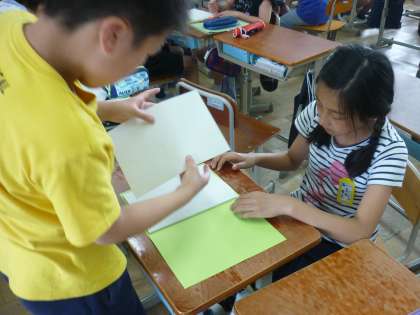 5年生は,1年生のためにたてわりグループの名札を作ってくれました。山の家から帰って間もないのに時間を作ってくれて,一字一字丁寧に名前を書き,きれいに色を塗ってくれています。今日はその名札を1年生に届けに行ってくれました。