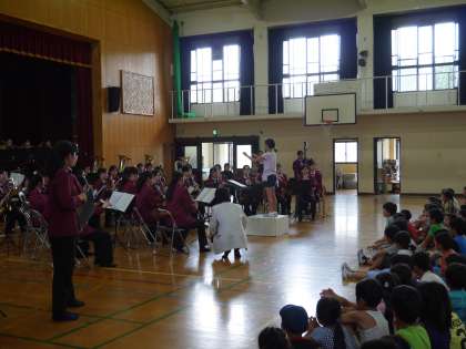 今日の5時間目,北稜高校吹奏楽部の皆さんにご来校いただき,素晴らしい演奏を聴かせていただきました。お忙しい中,そして暑い中,今日のために一生懸命準備していただき,感動する場面がたくさんありました。また,演奏だけでなく,北稜高校の生徒さんの靴の並べ方や挨拶の仕方,マナーなど,様々な場面でも勉強になりました。たくさんの楽器を一つ一つ紹介をしていただき,子どもたちは興味津々でした。