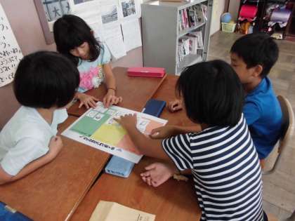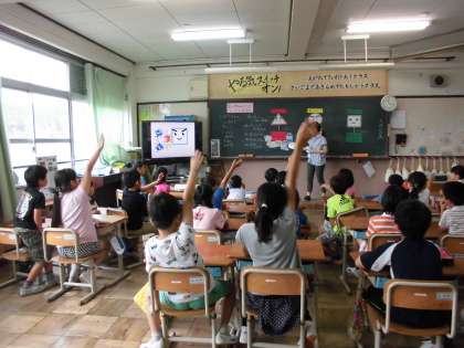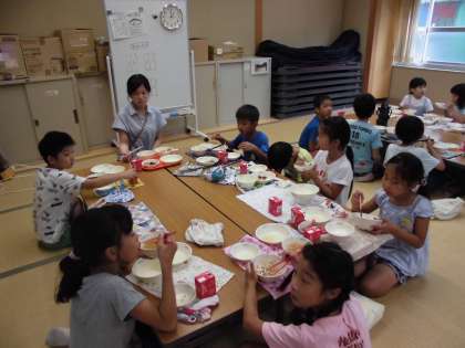 栄養教諭の梅原先生に食べ物の働きを教えていただきました。体をつくる「ツクルン」ねつや力のもとになる「パワーン」体の調子を整える「トトノエルン」という楽しいキャラクターが登場して,子どもたちは楽しく学ぶことができました。献立表を使って,自分たちでどのグループの食品かを分けてみると,給食の献立がバランスよく作られていることに気付くこともできました。この日の給食はパクパクルームで楽しくいただきました。