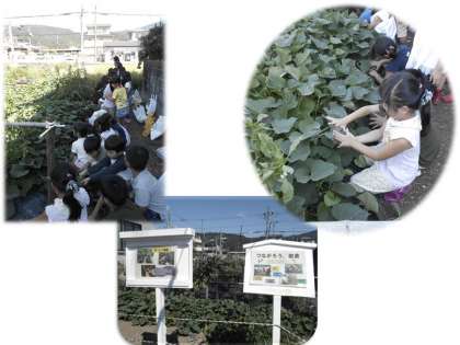 9月8日5校時,1年生がさつまいもの観察に明徳農園に行ってました。葉っぱの大きさを自分の手とくらべてみたり,葉の数の多さに驚いたりなどなど,子どもたちになりに観察を通して,いろいろな発見をしていました。