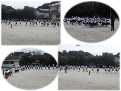今回は,3年生です。3年生は団体競技「バンブー大作戦!」の練習に励んでいます。初めに少し音楽に合わせた動きがあり,その後,競技に取り組みます。ルールの確認をしっかりとしながら,仲間と作戦を考えながら取組を進めています。各色の移動もきびきびとメリハリを意識した取組を目指して,練習に励んでいます。