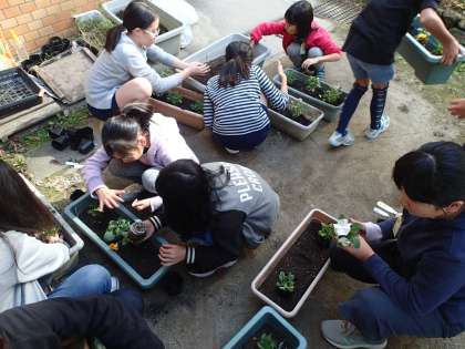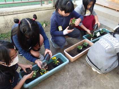 夏の間,中庭を飾っていたポーチュラカの花が終わったので,先月の委員会活動の時間にプランターの整理をしました。そして今日,そこに新しくパンジーとビオラを植えました。