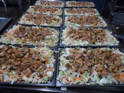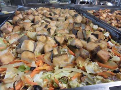 「さけのちゃんちゃん焼き」は,スチームコンベクションオーブンでみそ味をつけた鮭と野菜を蒸し焼きにしました。北海道の郷土料理です。