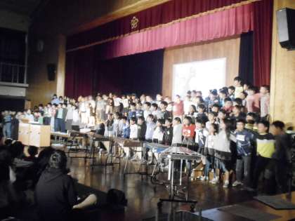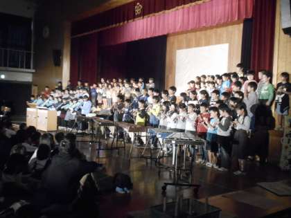歌と音楽,そして明徳小学校の歴史の今昔のスライドで,今年110周年を迎える明徳小学校へのお祝いの気持ちを発表しました。