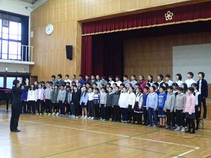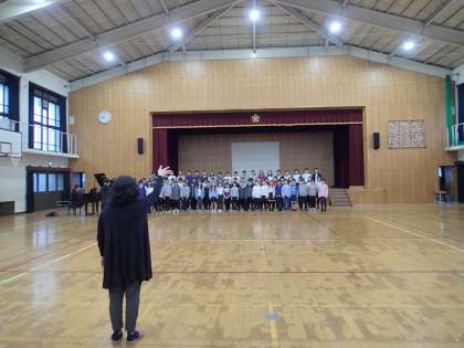 今朝は7時半に学校の体育館に集合し,大葭原先生や6年生の担任の先生の指導で発声練習とリハーサルをしました。