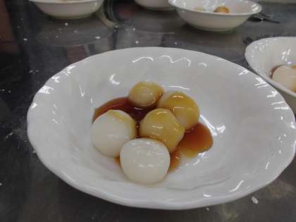 だんごは白玉粉をこねて茹でて作り,たれも,しょうゆと砂糖とかたくり粉と水を合わせて煮て作りました。