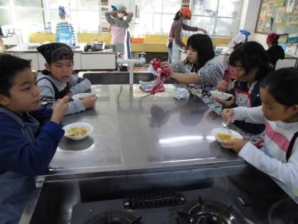 今年度3回目の料理クラブでの調理だったので,だいぶ手際よく,班のみんなで協力して楽しく作れました。