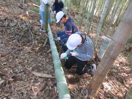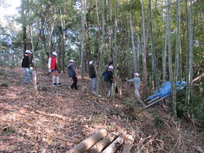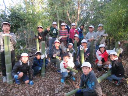 今日は,わきの山に竹を切りに行きました。竹を使った工作をするためです。みんなで力を合わせて4本の竹を切り倒し,運べる大きさに切りました。長い竹は結構重くて,学校まで運ぶのは大変でしたが,みんなとても楽しそうに活動していました。この竹を使って,どんな作品ができるか楽しみです。