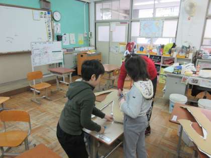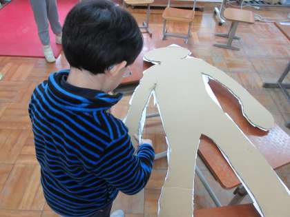 先日,ダンボールに自分の型を取って切った「もう一人の自分」に,白い画用紙を貼り,はみ出した所をハサミで切りました。来週は,洋服を描く予定です。