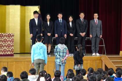 始業式に先立ち,この春の人事異動で明徳小学校に着任した教職員の着任式を行いました。今年の着任教職員は10名です。今日の着任式に出席された6名の教職員を前に子ども達は,「どの先生が担任の先生かな」「やさしそうな先生だな」と,笑顔で,新しく始まる1年間に胸をふくらませていました。