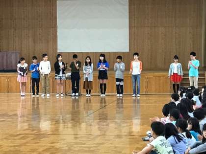 児童朝会では,新年度の児童会本部のメンバー,各委員長,各学級の代表委員を紹介しました。また,今年は新しく「めいとくマン」に代わって「めいとくレンジャー」が登場し,今月の児童会目標「自分から進んで元気にあいさつしよう」を全校児童にむけて発表しました。これから1年間,明徳小学校の正義を守るために活躍してくれることでしょう。