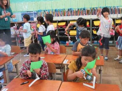初めは「リンゴの皮むき」。次は色紙を点線で折って,ラインに沿って切りました。開けてみたら動物の顔。