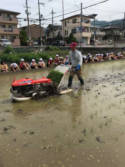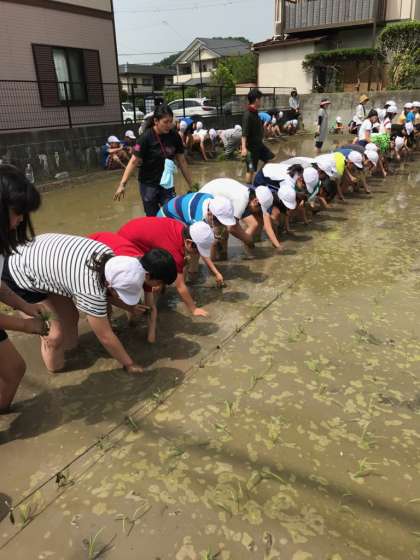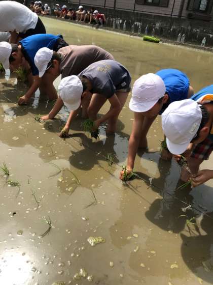 暑いほどの田植え日和。子どもたちが楽しみにしていた田植えを行いました。今年度は,畑の先生である山本さんから苗をいただき,田植えを体験しました。今年度もキヌヒカリという種類のうるち米です。田んぼに実際に足を入れる瞬間,ドキドキしている子,楽しみで仕方なく早く足を入れてみたい子,様々な表情を浮かべていました。苗を手に取り,印に沿って実際に植えていきます。1列目より2列目,2列目より3列目と,稲の苗を植えることに慣れてきた子どもたち。最初に戸惑っていた子たちも,手際良く植えることができました。楽しかったけど思っていたより難しいという子が多く,お米を育てることの難しさや大変さを感じるとともに,毎日食べているお米に感謝する機会にもなったのではないでしょうか。また,カグラモチというもち米の種類の苗を機械で植えていく様子も見せていただきました。