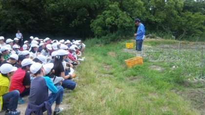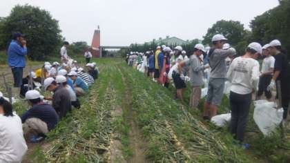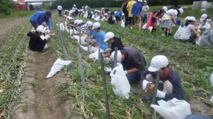 昼食後は,玉ねぎ掘りに挑戦です。お土産に持ち帰るとあって,みんな真剣に掘っています。今日掘った玉ねぎの種類は「レクスター」。早生で,みずみずしくて甘いのが特徴だそうです。