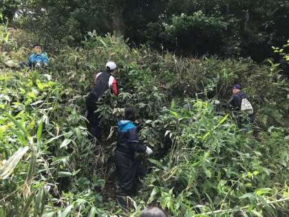 脇の山には,祇園祭のちまきにも使われる貴重なちまき笹が生息しています。ちまき笹の生長のためには,適度な日当たりが必要との助言から,今回は雑草や雑木を取り除き,笹の生息部分に日光が入るようになりました。