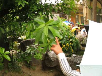 朝は外に行けないことを悲しんでいた子どもたちでしたが,学習が始まると「雨の音は面白い」「葉っぱが育つからうれしい」「かたつむりは雨が降ったら喜ぶね」などと雨を楽しんでいました。雨粒がたくさん落ちてくるところを探しに行ったり,雨粒を手のひらに乗せたり,雨の日を満喫していました。