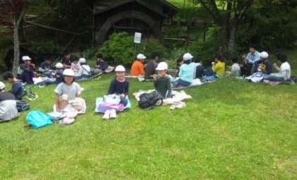 11時15分,予定通り昼食です。さわやかなお天気の下,芝生の上でのお弁当。いっそうおいしくいただきました。夕食は,自分たちでつくるカレーです。おいしくできるでしょうか。
