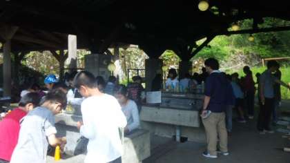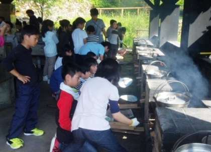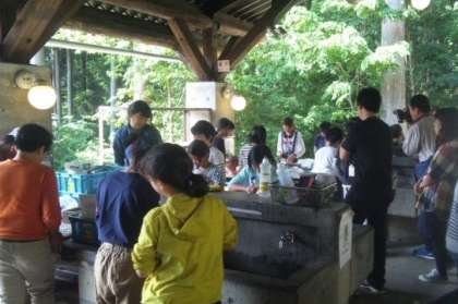 スコアオリエンテーリングの終了時刻がきちんと守れたため,野外炊事を早くはじめることができました。各グループ,分担して手際よくカレーライスづくりがすすんでいます。