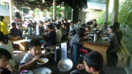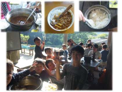 野外炊事のカレーライスが出来上がりました。去年のみさきの家での経験が生きて,上手にできました。自分たちでつくったカレーライスの味は格別です。
